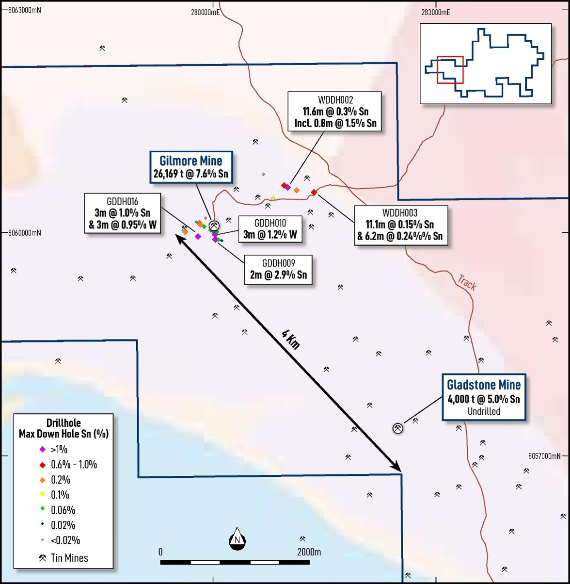 Numerous other mines exist in the Gilmore area including the Gladstone Mine 4km to the southeast where past production of 4,000 tonnes at 5% Sn is reported.
