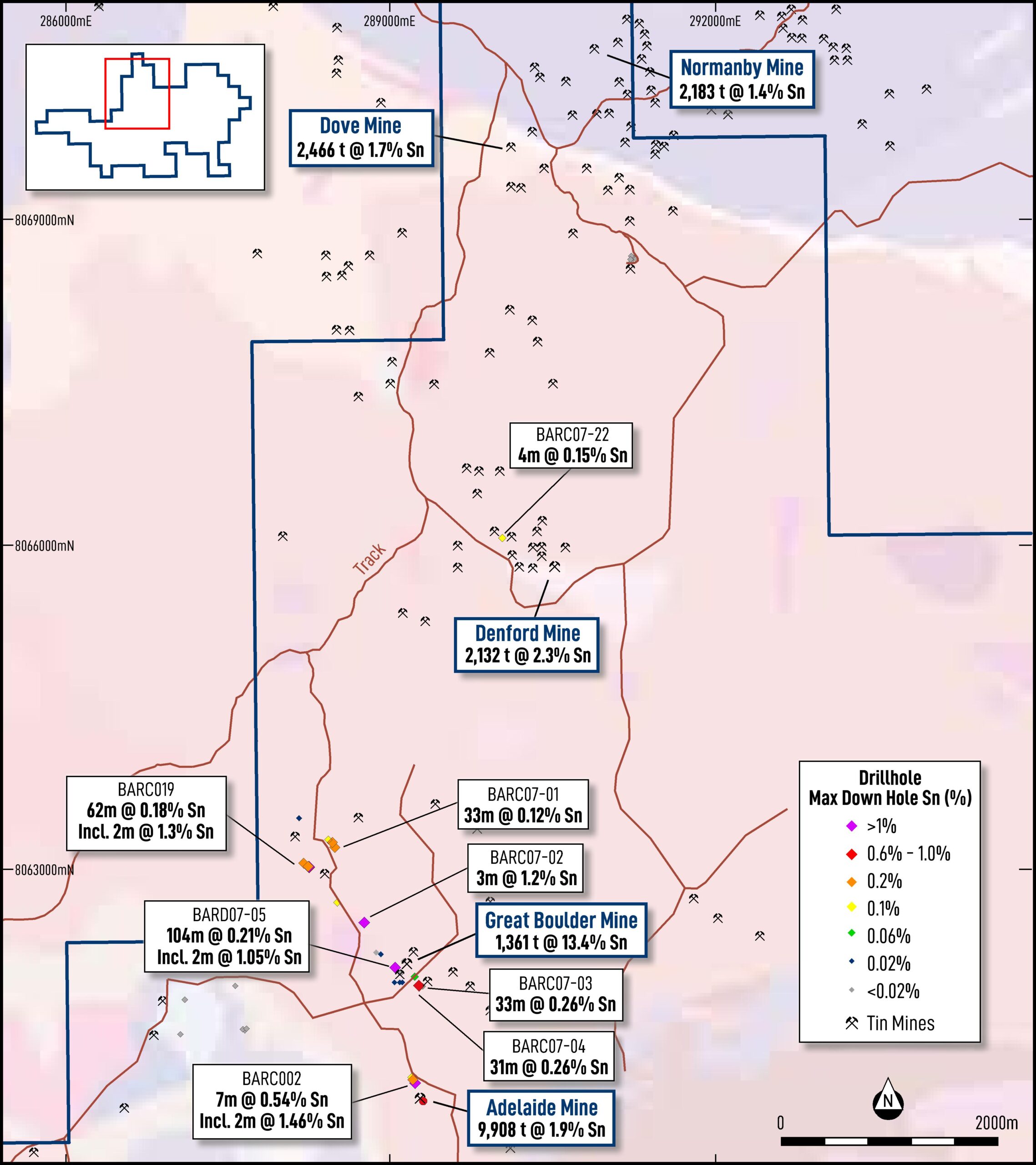 The Boulder Prospect extends over a strike length of approximately 3km, centred on the Great Boulder Mine, which produced 1,364 tonnes @ 13.4% Sn (see Figure 2). The area also includes alluvial tin workings that operated in numerous creeks in the area, predominantly south of the Boulder Prospect.