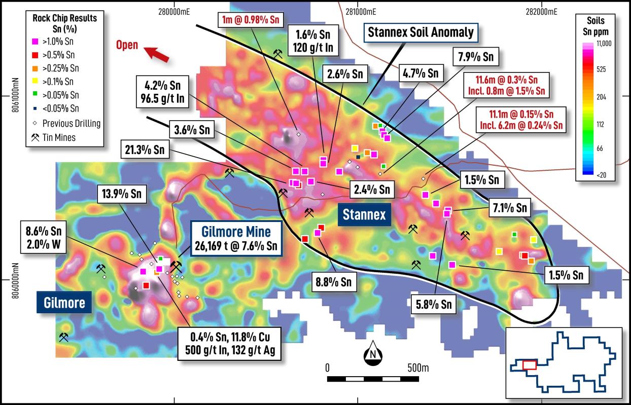 The Stannex Prospect is located approximately 1km east of the Gilmore Tin Mine. During the 1970s a series of very high-tenor tin-in-soil geochemistry anomalies were delineated at the Stannex Prospect and the Gilmore Mine (see Figure 2). The large, strong soil anomaly extends over a strike length of 2km and is up to 0.5km wide at the Stannex Prospect. It remains open along strike to the northwest.
